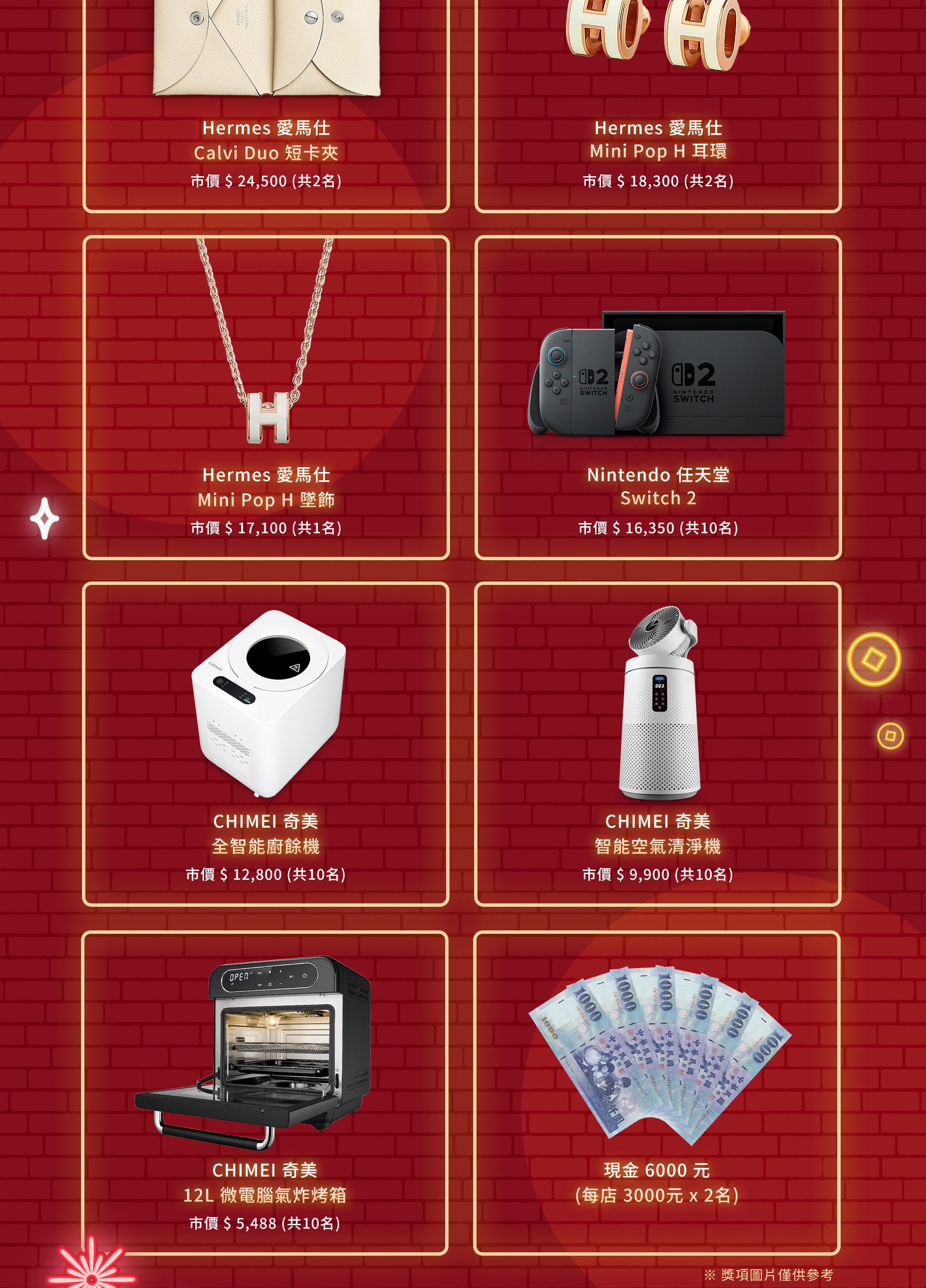 Prize delivery is limited to Taiwan’s main island. Locations without elevators will receive delivery to the first floor only.